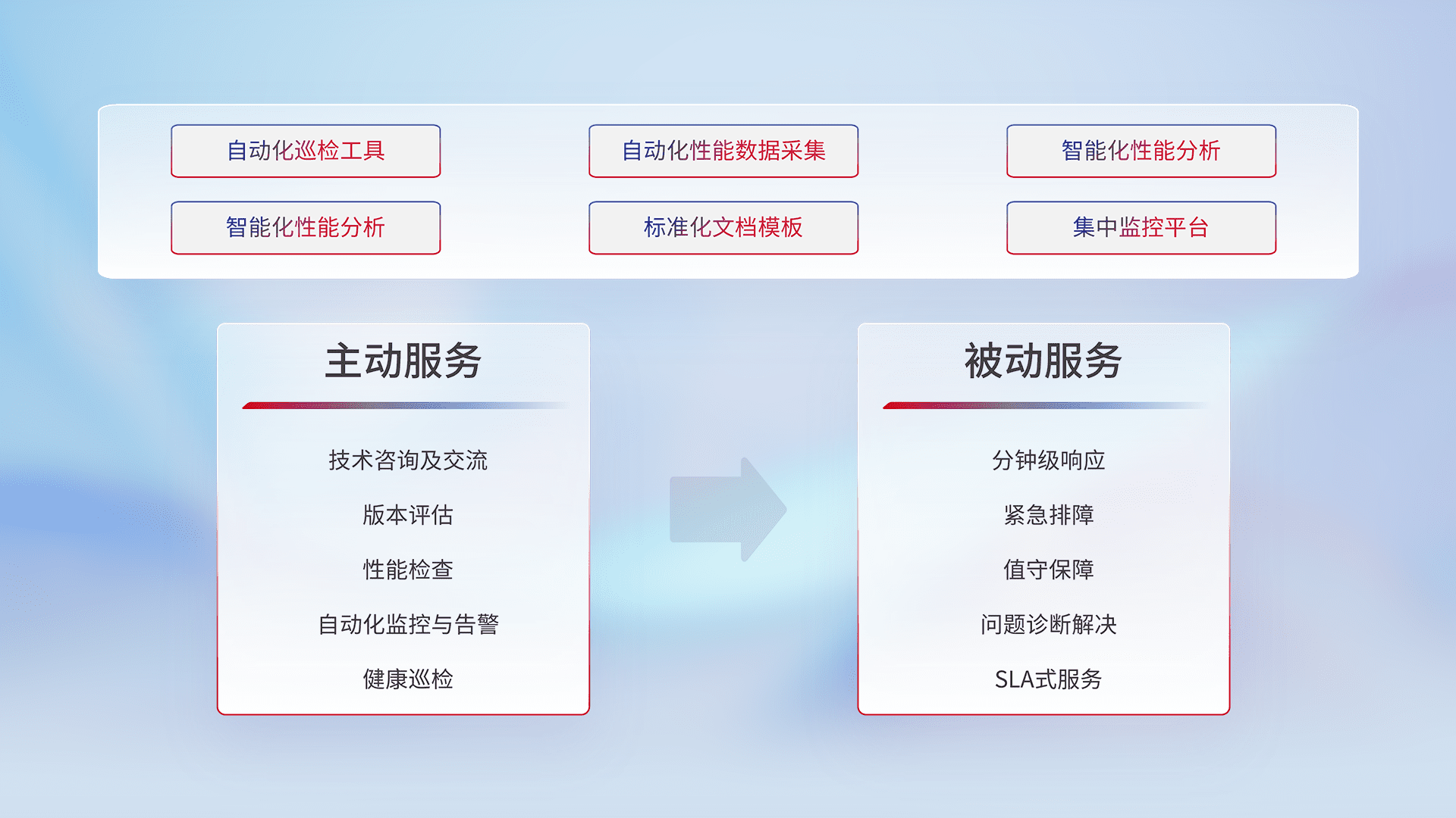 智能化工具和标准化文档,,,,保障服务质量,,,提供主动服务(包含技术咨询、、版本评估、、、、性能检查、、、自动化监控与告警、、、健康巡检)和被动服务包含(分钟级响应、、、、紧急排障、、、值守保障、、、、问题诊断解决、、、SLA服务)。。。